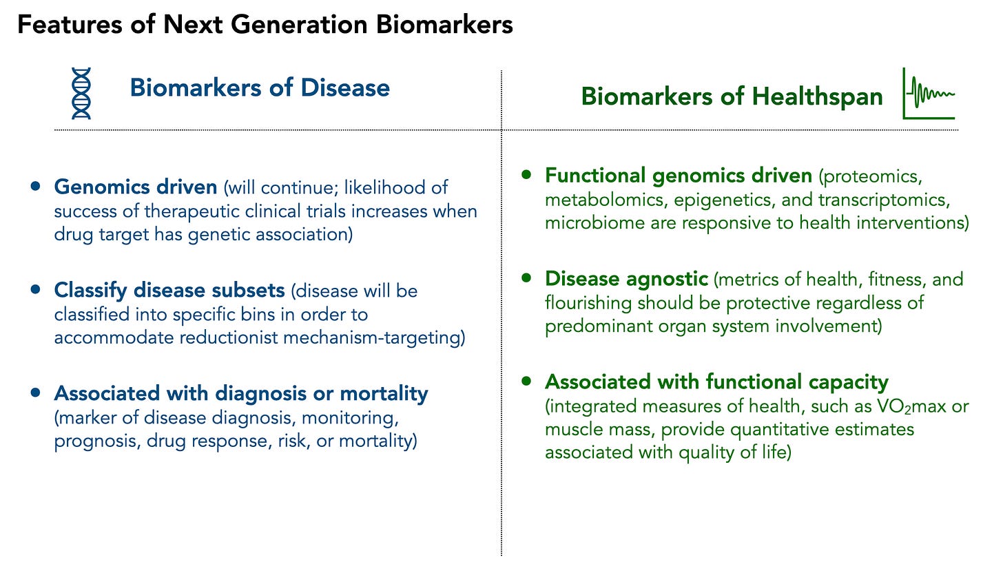I believe that natural evolution of biomarker development will diverge into two key classifications: biomarkers of disease (traditional approach, novel techniques) and biomarkers of healthspan (novel approach, new frontier)