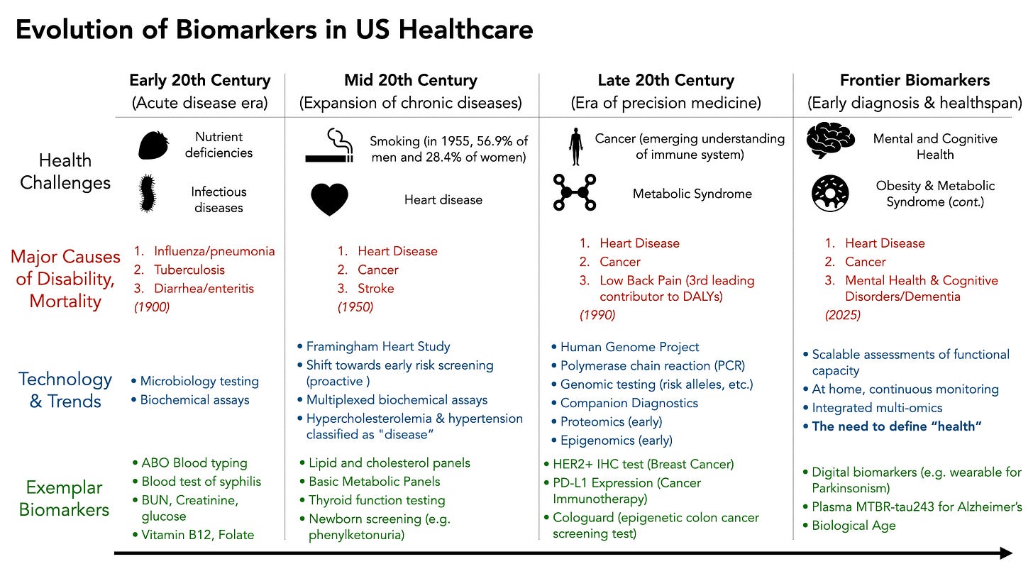 From measuring infectious disease and acute markers of illness, to precision medicine, to defining healthspan, biomarker development and deployment has followed the pressing needs of population health